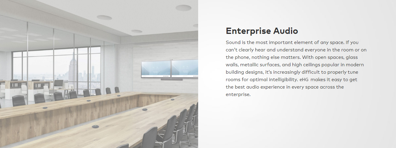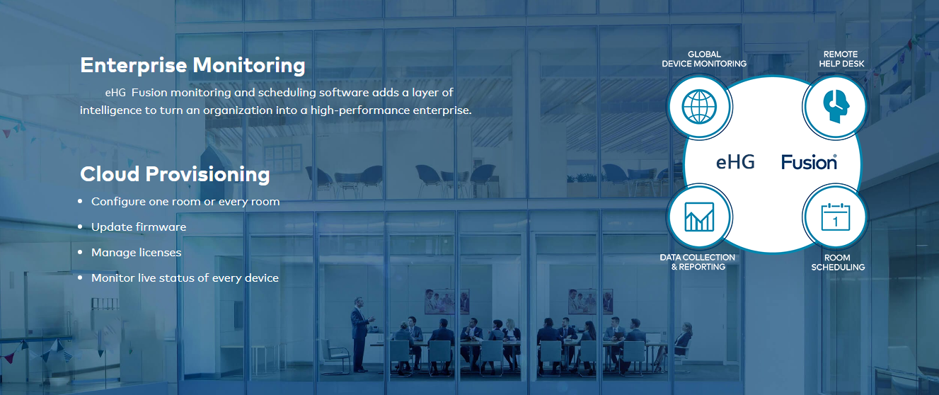 eHG Enterprise Room Solutions optimize workflow and resource management, so people work smarter and more efficiently. eHG is the only single platform that enables you to easily do whatever you want – call, present, collaborate - in all your spaces, and manage them securely on the network.