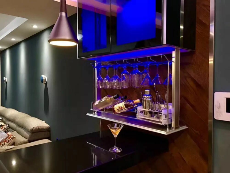 高科技电控设备做驱动装置,确保自动升降的稳定、高效、安全,通过触摸可在有效升降范围内随心所欲升降,升降过程很人性化,当升降柜下降到一般行程时,箱内灯就会自动亮起来,方便取放,反之关灭。